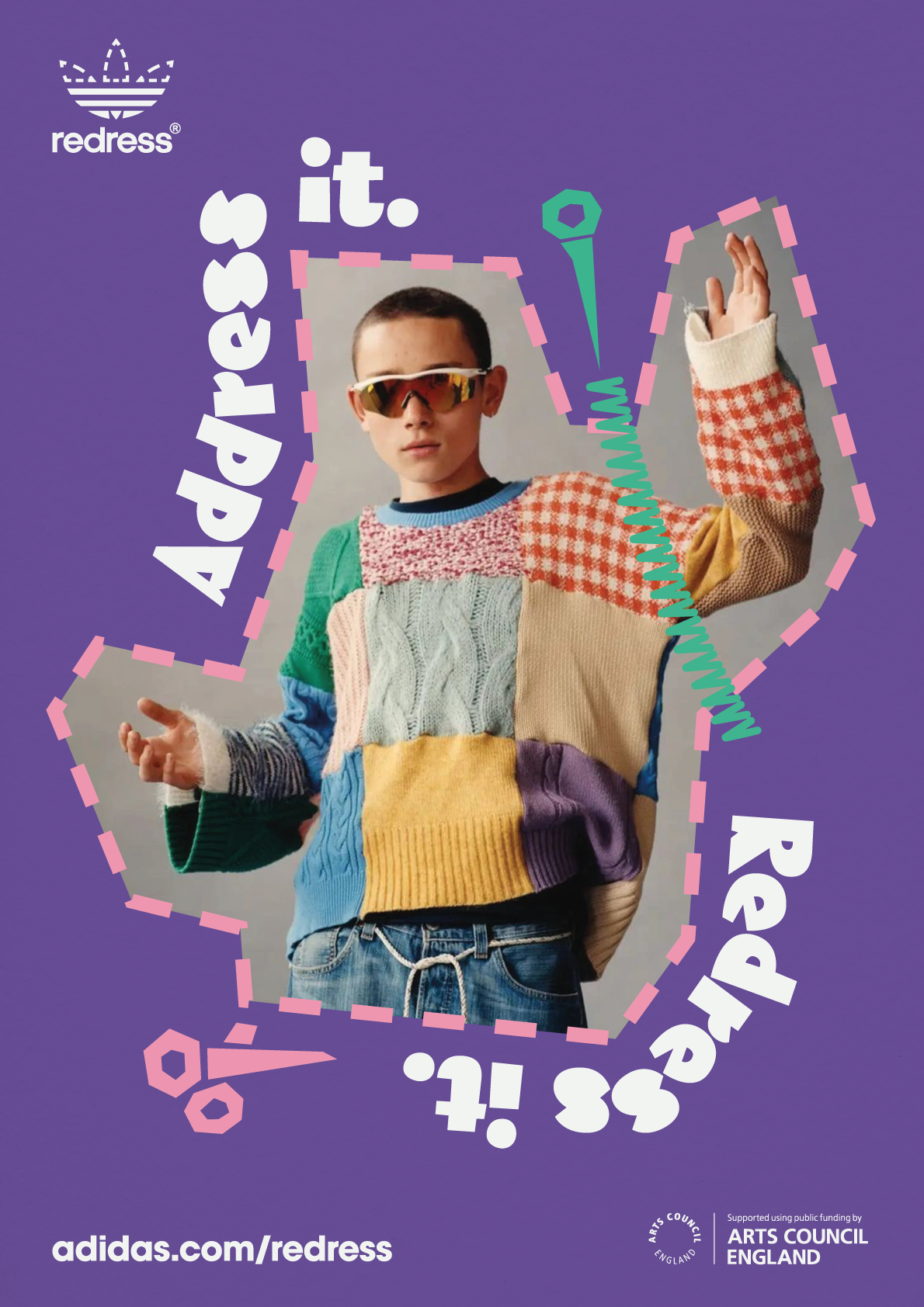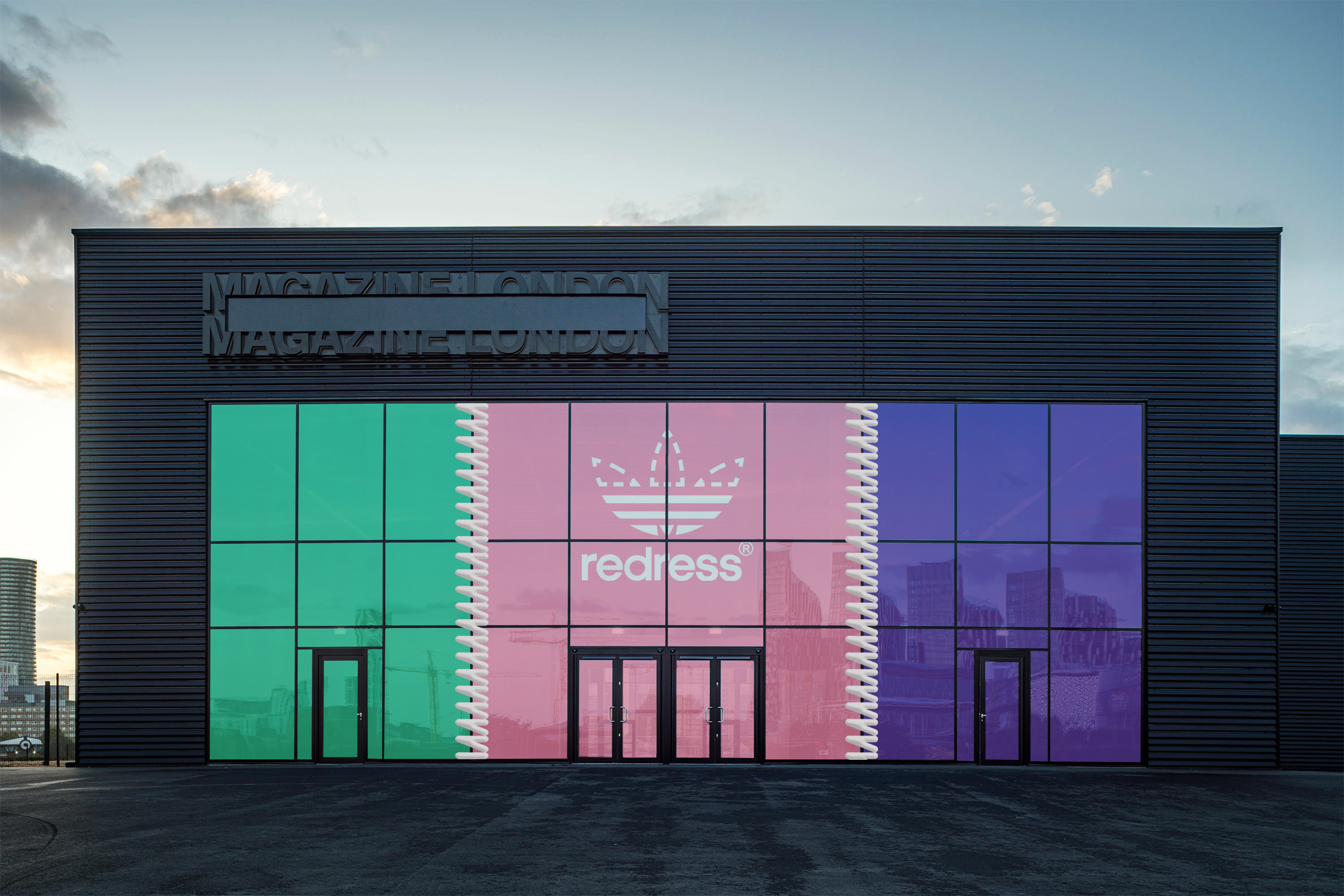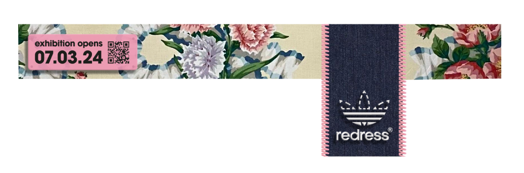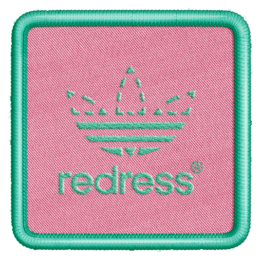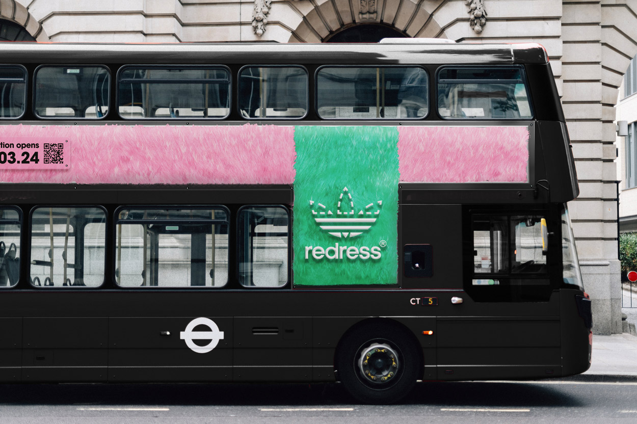Adidas’ iconic trefoil logo is adapted to include a stitch pattern around the top half and the word Redress in place of the Adidas name. The ubiquitous logo form makes it instantly recognisable when displayed in public settings.