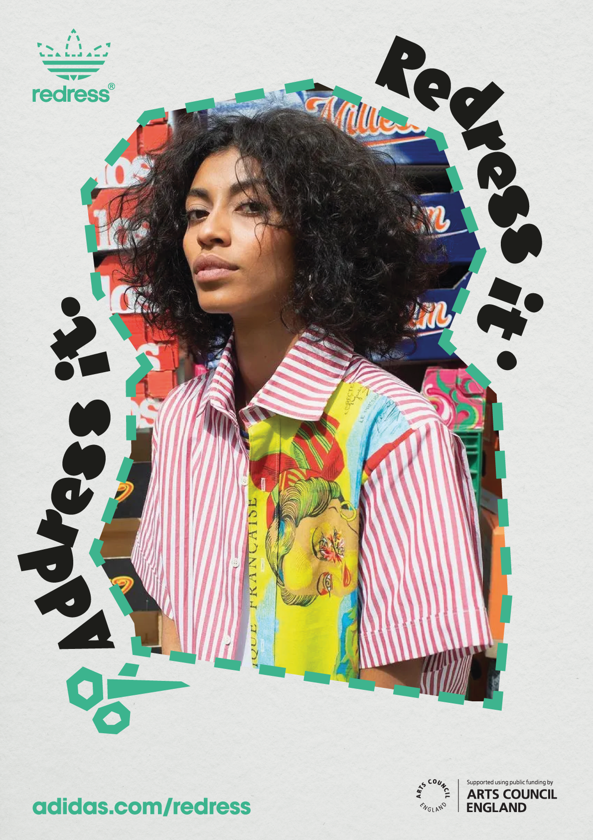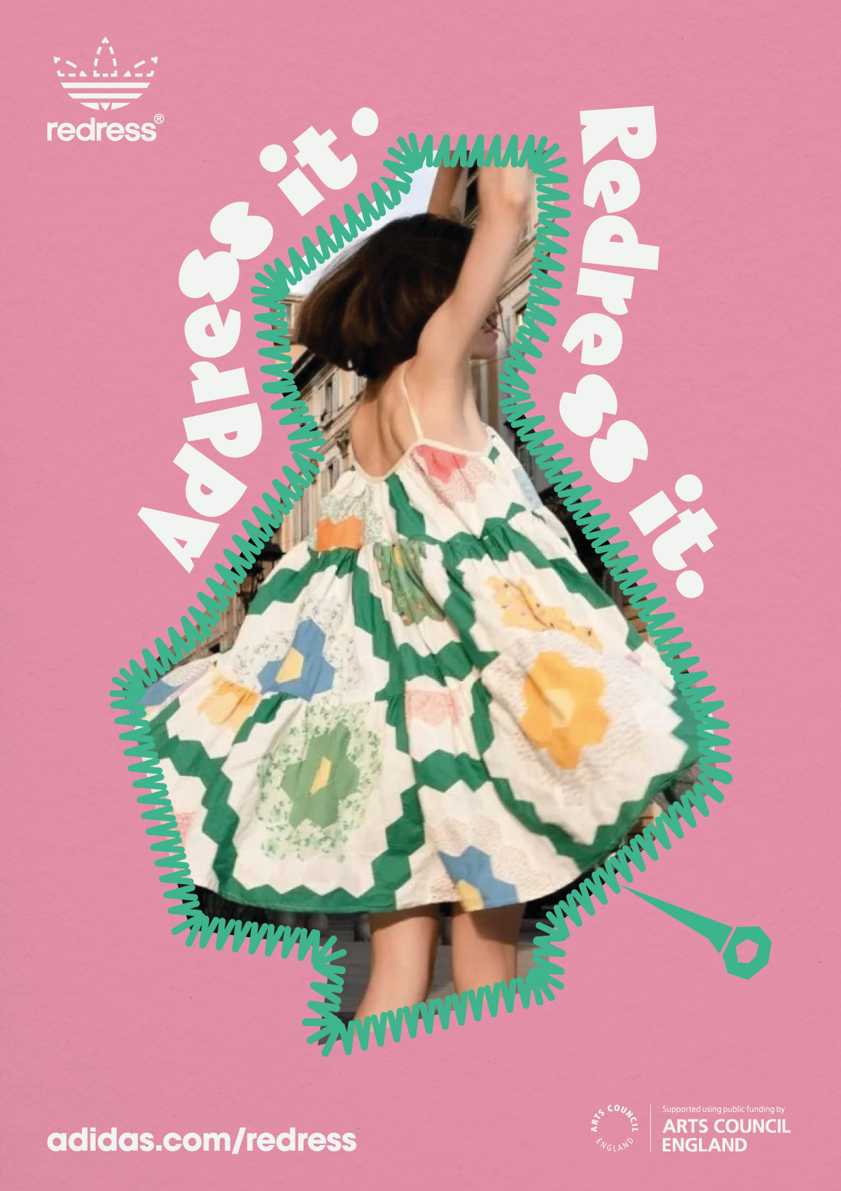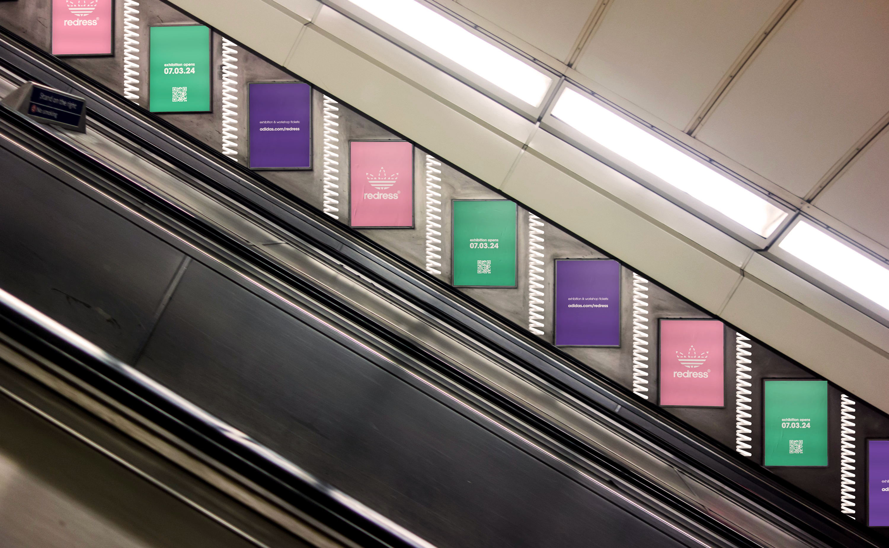 Adidas’ iconic trefoil logo is adapted to include a stitch pattern around the top half and the word Redress in place of the Adidas name. The ubiquitous logo form makes it instantly recognisable when displayed in public settings.