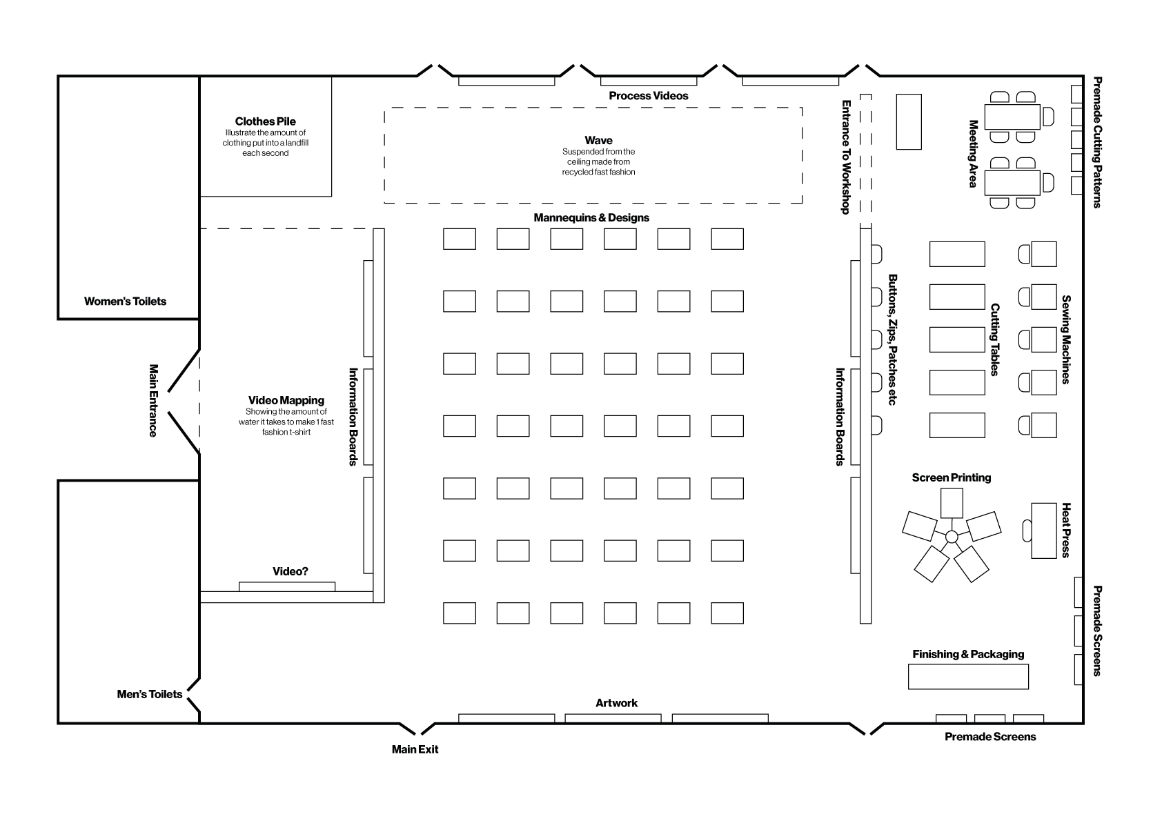 The workshop is a pre-booked activity that allows visitors to bring an item of fast fashion and customise it using the tools provided with assistance from onsite experts. It has a planning area, sewing machines, pattern cutting capabilities, heat presses, screen printing with pre-made screens, and a finishing area.